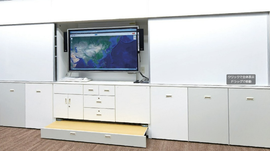 充電器や周辺設備などICTアイテムをすっきり収納できます。電子黒板機能つき70型モニターを設置でき、三面引き戸は黒板やホワトボードを選択できます。教室の限られたスペースへの設置も可能です。